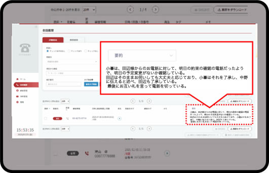 複雑な会話内容でも、要約文を読むだけでその要点を瞬時に理解し、担当者不在時の伝言や、過去の顧客対応内容の確認、引き継ぎ作業などが効率化。